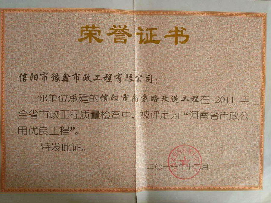 好風憑借力,送我上青云。近年來,公司積極參與城市市政基礎設施建設施工,積極參與市場競爭,先后承擔施工了市政府重點工程南京路道路改造工程、春曉路道路改造工程,東方紅大道道路改造工程、龍江東路新建工程等重點民生工程,其中南京路道路改造工程被省建設廳評為“中州杯”, 春曉路和東方紅大道道路改造工程被省建設廳評為“省優工程”,成為城區一道道亮麗的風景線。參與施工了市典范小區“臺北城上城”、“恒大名都”以及師范學院、職業技術學院、交警支隊和軍區道路工程,參與施工了雞公山管理區、南灣管理區、明港鎮和羅山縣等部分道路小區工程施工,累計大小各類施工工程三百余項,企業影響力不斷擴大、輻射力不斷增強,市場份額不斷提高,企業信譽不斷彰顯,為信陽城市建設做出了積極貢獻,為企業的可持續發展插上了騰飛的翅膀。